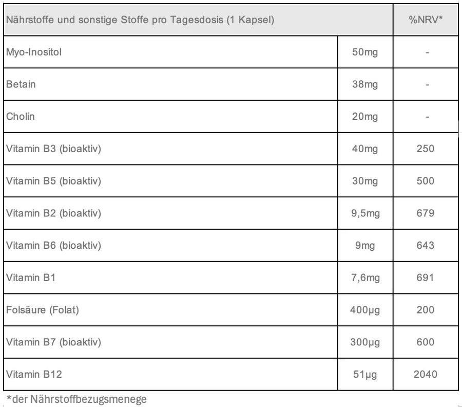 Komplex aus allen 8 B-Vitaminen (bioaktiv) + 3 Co-Faktoren Myo-Inositiol, Betain und Cholin