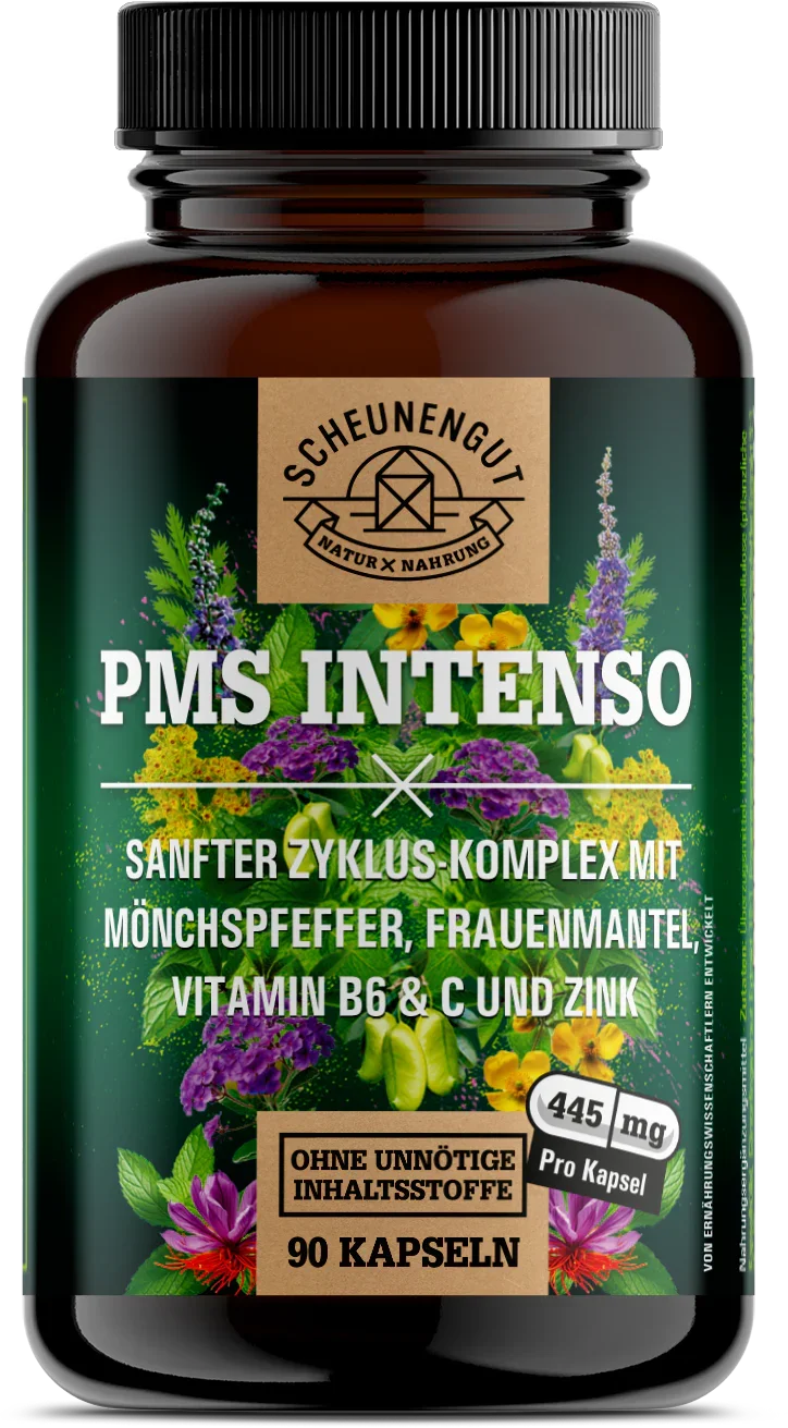PMS INTENSO® PMS capsules - IMPORTANT: Laboratory-tested vital complex with chasteberry, cinquefoil, lady's mantle, saffron, vitamin C, B6, zinc I 90 capsules I Scheunengut®