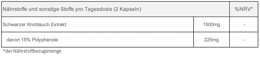 Schwarzer Knoblauch Extrakt 25:1 (davon 15% Polyphenole und S-Allylcystein), Überzugsmittel: Hydroxypropylmethylcellulose (pflanzliche Kapselhülle).