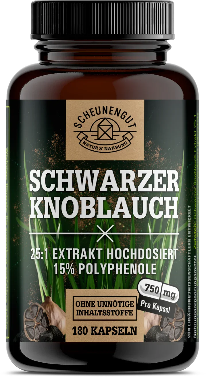 • Hochdosierter Dualextrakt 25:1 aus fermentierten schwarzen Knoblauch-Zehen