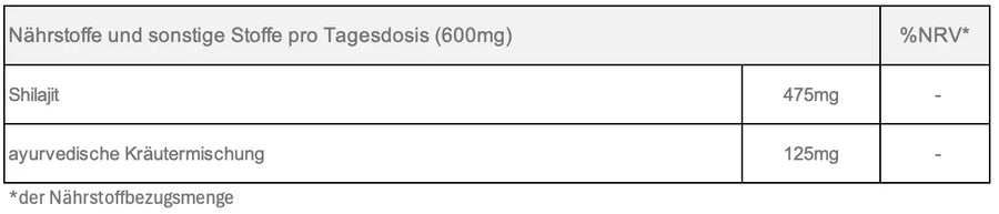 Shilajit Harz (Himalaya Gebirge auf ca. 5.500m geerntet), ayurvedische Kräutermischung (Ashwagandha Wurzelextrakt (5% Withanolide), Kurkuma Wurzelextrakt, Tribulus terrestris Extrakt).